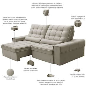 Peça única com dois assentos retráteis, tapeçados com espuma D-26, molas ensacadas e molas espirais.