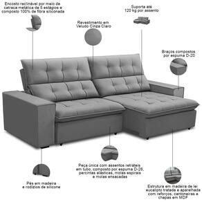 Sofá Retrátil Reclinável Para Sala 3 Lugares 250cm Vincent F04 Veludo Cinza Claro - Lyam Decor