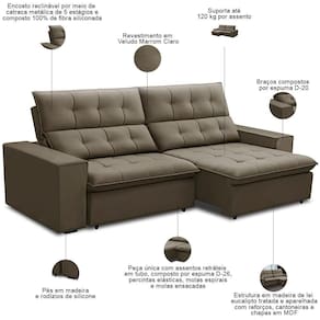 Cor: Marrom Claro | Peso: 80 Kg | Orientação do Sofá: Frontal | Cor dos pés: Marrom | Densidade da espuma do assento: D-26 | Unidades por kit: 1 | Mecanismo de abertura do produto: Manual, rodízios de silicone | Formato do sofá: Linear | Linha: Sala de Estar | Desenho do tecido: Liso | Tipo de produto: Sofá Retrátil Reclinável | Profundidade: 98 cm | Material de enchimento do encosto: Fibra Siliconada | Requer montagem: Não | Estilo: Moderno | Fabricante: Lyam Decor | Quantidade de Caixas de embalagem: 1 | Altura: 110 cm | Material do estofamento: Veludo | Largura: 250 cm | Peso máximo suportado: 240 kg