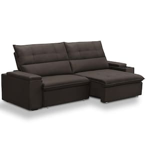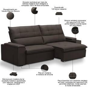 Unidades por kit: 1 | Cor: Marrom Escuro | Requer montagem: Não | Tipo de produto: Sofá Retrátil Reclinável | Peso máximo suportado: 240 kg | Peso: 90 kg | Orientação do Sofá: Frontal | Mecanismo de abertura do produto: Manual, rodízios de silicone | Material do estofamento: Veludo | Material de enchimento do encosto: Fibra Siliconada | Linha: Sala de Estar | Estilo: Moderno | Formato do sofá: Linear | Desenho do tecido: Liso | Densidade da espuma do assento: D-26 | Cor dos pés: Marrom | Fabricante: Lyam Decor | Profundidade: 98 cm | Altura: 110 cm | Largura: 270 cm | Quantidade de Caixas de embalagem: 2