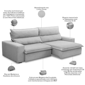 Altura: 110 cm | Color: Cinza | ColorFamily: Cinza | ColorSimple: Cinza | ColorSupplier: Cinza | Cor: Cinza | Densidade da espuma do assento: D-26 | Desenho do tecido: Liso | Estilo: Moderno | Fabricante: Lyam Decor | Formato do sofá: Linear | Largura: 280 cm | Linha: Sala de Estar, Living | Material: Madeira de Eucalipto, Cantoneiras, Chapas em MDF | Material de enchimento do encosto: Fibra Siliconada | Material do estofamento: Linho | MaterialFamily: Madeira de Eucalipto | Mecanismo de abertura do produto: Manual | Model: Senzi | Orientação do Sofá: Frontal | OriginCountry: Brasil | OriginState: PR | Peso: 109 kg | Peso máximo suportado: 360 kg | ProductContents: 01 Sofá | ProductHeight: 110 cm | ProductInstructions: Produto para uso em ambiente interno, nao devendo ficar exposto ao sol, calor e umidade excessivos. | ProductLength: 110 cm | ProductWarranty: 90 dias após o recebimento do produto | ProductWeight: 109 kg | ProductWidth: 280 cm | Profundidade: 110 cm | Quantidade de Caixas de embalagem: 2 | Requer montagem: Não | SizeDescription: Altura: 110 cm x Largura: 280 cm x Profundidade: 110 cm | SupplierSimpleName: Sofá Retrátil Reclinável Para Sala 4 Lugares 280cm Senzi F04 Linho Cinza - Lyam Decor | Tipo de produto: Sofá Retrátil Reclinável | Unidades por kit: 1