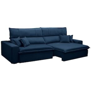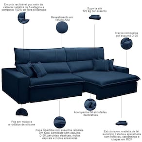 Unidades por kit: 1 | Cor: Azul | Requer montagem: Não | Tipo de produto: Sofá Retrátil Reclinável | Peso máximo suportado: 240 kg | Peso: 110 kg | Orientação do Sofá: Frontal | Mecanismo de abertura do produto: Manual, rodízios de silicone | Material do estofamento: Veludo | Material de enchimento do encosto: Fibra Siliconada | Linha: Sala de Estar | Estilo: Moderno | Formato do sofá: Linear | Desenho do tecido: Liso | Densidade da espuma do assento: D-26 | Cor dos pés: Marrom | Fabricante: Lyam Decor | Profundidade: 121 cm | Altura: 115 cm | Largura: 290 cm | Quantidade de Caixas de embalagem: 2
