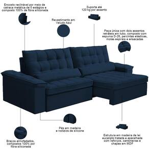 Unidades por kit: 1 | Cor: Azul | Requer montagem: Não | Tipo de produto: Sofá Retrátil Reclinável | Peso máximo suportado: 240 kg | Peso: 110 kg | Orientação do Sofá: Frontal | Mecanismo de abertura do produto: Manual, rodízios de silicone | Material do estofamento: Veludo | Material de enchimento do encosto: Fibra Siliconada | Linha: Sala de Estar | Estilo: Moderno | Formato do sofá: Linear | Desenho do tecido: Liso | Densidade da espuma do assento: D-26 | Cor dos pés: Marrom | Fabricante: Lyam Decor | Profundidade: 121 cm | Altura: 110 cm | Largura: 290 cm | Quantidade de Caixas de embalagem: 2