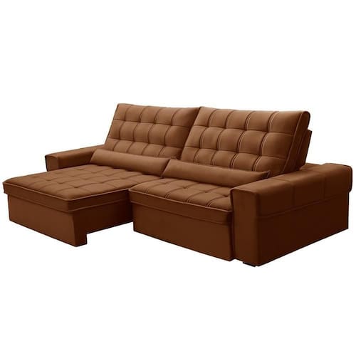 Densidade da espuma do assento: D-26 | Cor dos pés: Marrom | Fabricante: Lyam Decor | Profundidade: 121 cm | Altura: 115 cm | Largura: 290 cm | Quantidade de Caixas de embalagem: 2 | Unidades por kit: 1 | Material de enchimento do encosto: Fibra Siliconada | Orientação do Sofá: Frontal | Mecanismo de abertura do produto: Manual, rodízios de silicone | Peso: 110 kg | Linha: Sala de Estar | Requer montagem: Não | Peso máximo suportado: 240 kg | Material do estofamento: Veludo | Desenho do tecido: Liso | Tipo de produto: Sofá Retrátil Reclinável | Cor: Terracota | Formato do sofá: Linear | Estilo: Moderno