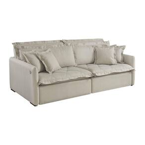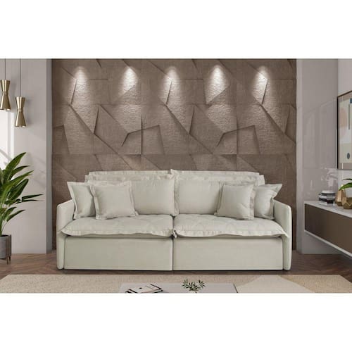Produto feito com madeira de reflorestamento e revestido com tecido em linho. No assento, além da espuma D28, contamos com as molas de aço que auxíliam na sustentação e retorno do nível, aumentando o conforto e durabilidade do produto. O encosto possui fibra de silicone. Possui ainda rodinhas de silicone e pés de madeira maciça e Kit USB Acompanha Almofadas extras: Não Almofada do assento: Removível Almofada do encosto: Removível Altura do assento até o chão: 50 cm Altura do Encosto: 45 cm Ambiente Principal: Sala de Estar Complexidade da Montagem: Baixa: pode ser montado por uma pessoa sozinha Cor: Bege Cor do Produto: Bege Densidade do Assento: D-28 Densidade do Encosto: Camadas de Densidades Diferentes Enchimento do Assento: Espuma Enchimento do Encosto: Fibra Siliconada Estilo de Braço: Braços Redondos Firmeza do Assento: Macio Informações Complementares: Kit USB Itens Inclusos: 1 Sofá, Manual de Montagem Linha ou Coleção: Bardot Manual de Montagem e Instalação: https://product-hub-prd.madeiramadeira.com.br/873887/documents/5396f626-2418-4510-973b-9331dcca92a24390estofadobardotestofart.pdf Material dos Pés: Madeira Montagem Flex: Não Necessita Montagem: Sim Origem do Produto: Nacional Peso: 90 kg Pet Friendly: Não Possui Entrada USB: Não Possui Percintas Elásticas: Sim Possui Pés: 08 Possui Rodízio: Não Profundidade Quando Estendido: 154 cm Recomendações de Uso, Manutenção e Limpeza: Não expor ao sol ou fonte de calor; Não utilizar produtos de limpeza como detergente, álcool, solventes, ou produtos químicos; Para a limpeza, utilizar pano umedecido em água, sabão neutro e escova de cerdas macias, deixando secar a sombra. Em caso de excesso de poeira, usar aspirador de pó; Não provocar tensões desproporcionais no assento do sofá, provocadas pro quedas ou pulos; Evitar contatos com animais; Preservar o produto de objetos aquecidos ou pontiagudos; Mantê-lo em local arejado; Transportar com o máximo de cautela. Sistema de Montagem: Parafusos Suporta Até (kg): 100 kg Tecido Predominante: Linho Tipo de Encosto: Regulável Tipo de Mola: Molas Bonnel Ean: 7909903451434