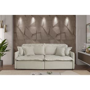 Produto feito com madeira de reflorestamento e revestido com tecido em linho. No assento, além da espuma D28, contamos com as molas de aço que auxíliam na sustentação e retorno do nível, aumentando o conforto e durabilidade do produto. O encosto possui fibra de silicone. Possui ainda rodinhas de silicone e pés de madeira maciça. Acompanha Almofadas extras: Não Almofada do assento: Removível Almofada do encosto: Removível Altura do assento até o chão: 50 cm Altura do Encosto: 45 cm Ambiente Principal: Sala de Estar Complexidade da Montagem: Baixa: pode ser montado por uma pessoa sozinha Cor: Bege Cor do Produto: Bege Densidade do Assento: D-28 Densidade do Encosto: Camadas de Densidades Diferentes Enchimento do Assento: Espuma Enchimento do Encosto: Fibra Siliconada Estilo de Braço: Braços Redondos Firmeza do Assento: Macio Itens Inclusos: 1 Sofá, Manual de Montagem Linha ou Coleção: Bardot Manual de Montagem e Instalação: https://product-hub-prd.madeiramadeira.com.br/873864/documents/0864e92b-f62a-410d-9336-b8fbd17c87954390estofadobardotestofart.pdf Material dos Pés: Madeira Montagem Flex: Não Necessita Montagem: Sim Origem do Produto: Nacional Peso: 108 kg Pet Friendly: Não Possui Entrada USB: Não Possui Percintas Elásticas: Sim Possui Pés: 08 Possui Rodízio: Não Profundidade Quando Estendido: 154 cm Recomendações de Uso, Manutenção e Limpeza: Não expor ao sol ou fonte de calor; Não utilizar produtos de limpeza como detergente, álcool, solventes, ou produtos químicos; Para a limpeza, utilizar pano umedecido em água, sabão neutro e escova de cerdas macias, deixando secar a sombra. Em caso de excesso de poeira, usar aspirador de pó; Não provocar tensões desproporcionais no assento do sofá, provocadas pro quedas ou pulos; Evitar contatos com animais; Preservar o produto de objetos aquecidos ou pontiagudos; Mantê-lo em local arejado; Transportar com o máximo de cautela. Sistema de Montagem: Parafusos Suporta Até (kg): 100 kg Tecido Predominante: Linho Tipo de Encosto: Regulável Tipo de Mola: Molas Bonnel Ean: 7909903451373