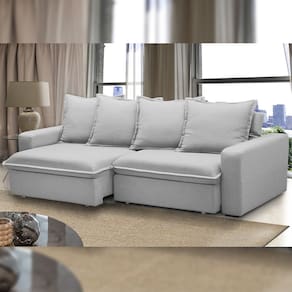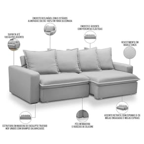 Encosto reclinável por meio de catraca metálica com 5 estágios e almofadas soltas 100% em fibra siliconada.
