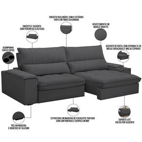 Altura: 115 cm | Color: Cinza | ColorFamily: Cinza | ColorSimple: Cinza | ColorSupplier: Grafite | Cor: Grafite | Cor dos pés: -1 | Densidade da espuma do assento: D-26 | Desenho do tecido: Liso | Estilo: Moderno | Fabricante: Lyam Decor | Formato do sofá: Linear | Largura: 280 cm | Linha: Sala de Estar, Living | Material: Madeira de lei (Eucalipto) devidamente tratada e aparelhada com reforços e cantoneiras e chapas em M | Material de enchimento do encosto: 100% de Fibra Siliconada | Material do estofamento: Bouclê | MaterialFamily: Tecido, Madeira | Mecanismo de abertura do produto: -1 | Model: Nápoles | Orientação do Sofá: -1 | OriginCountry: Nacional | OriginState: PR | Peso: 110 kg | Peso máximo suportado: 100 kg | ProductContents: 01 Sofá | ProductHeight: 280 cm | ProductInstructions: Produto para uso em ambiente interno, nao devendo ficar exposto ao sol, calor e umidade excessivos. | ProductLength: 110 cm | ProductWarranty: 90 dias após o recebimento do produto | ProductWeight: 110 kg | ProductWidth: 115 cm | Profundidade: 110 cm | Quantidade de Caixas de embalagem: 1 | Requer montagem: Não | SizeDescription: Altura: 115 cm x Largura: 280 cm x Profundidade: 96 cm | SupplierSimpleName: Sofá Retrátil Reclinável Para Sala de Estar Living 280cm Nápoles F04 Bouclê Grafite - Lyam Decor | Tipo de produto: Sofá | Unidades por kit: 1