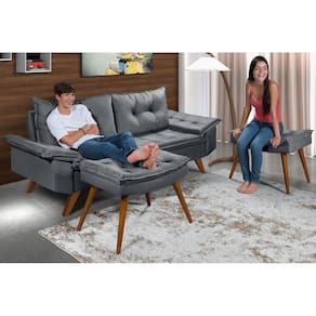 - Fácil complexidade: encaixar os braços nas laterais, deitar o sofá de costas, fixar os pés e parafusar. Levantar o sofá na posição normal.