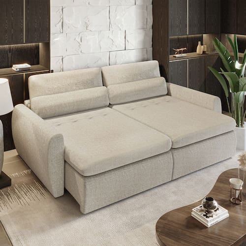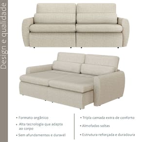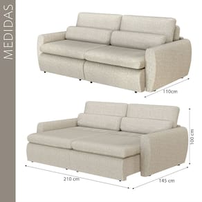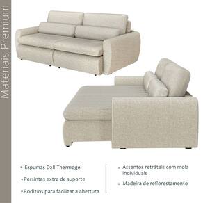 Características: Tipo: Sofá-Cama Retrátil Modelo: Charlie Cor: Bege Revestido em Linho Espuma D28 Thermogel para maior conforto térmico; Tripla camada de conforto; Assentos retráteis com molas individuais; Percintas elásticas extra de suporte; Rodízios que facilitam a abertura; Almofadas soltas; Estrutura em madeira de reflorestamento; Estrutura reforçada e durável; Alta tecnologia que se adapta ao corpo;