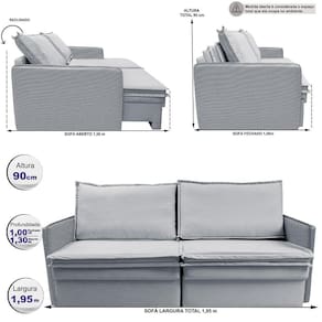 Medidas do Produto Montado: Altura: 90cm Profundidade retrátil aberto: 1,30m Profundidade retrátil fechado: 1,00m Largura: 1,95m Profundidade do Baú: 65cm