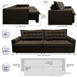 Medidas do Produto Montado: Altura: 0,96cm Profundidade como Sofá: 1,00m Profundidade como Cama: 1,28m Largura: 2,35m