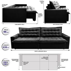 Sofá Sem Caixa Retrátil Reclinável 2,35m Cama inBox França. Velusoft - Preto
