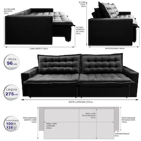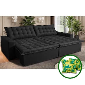 Sofá Sem Caixa Retrátil Reclinável 2,75m Cama inBox França. Velusoft - Preto