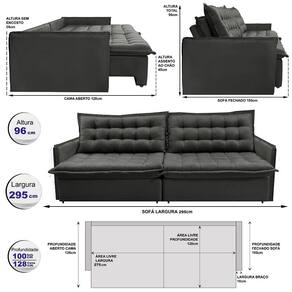 Sofá Sem Caixa Retrátil Reclinável 2,95m Cama inBox Versátil. com Pillow Top e Molas Velusoft - Cinza
