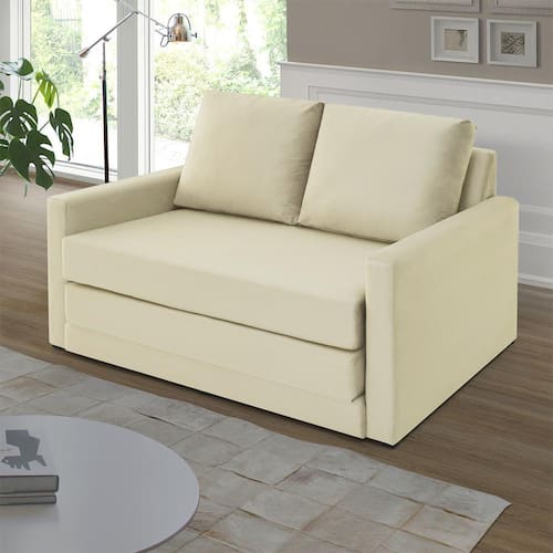 Assentos com espuma flexível de poliuretano densidade 26kg/m, certificada, fabricação própria. Com assento dobráveis, ela abre totalmente virando uma cama. Enchimento do encosto: espuma D-26 e fibra de poliéster siliconada. Estrutura de madeira maciça de pinus e eucalipto 100% reflorestada. Fixação da estrutura: grampos galvanizados anti-ferrugem. Apoiados no chão com sapatas de pvc. Revestimento/tecido: veludo 100% poliéster, com toque macio.