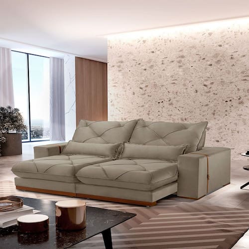 Assento: Retrátil com Percinta elástica, molas ensacadas e molas espirais, espuma D-28, pillow de 25 cm.