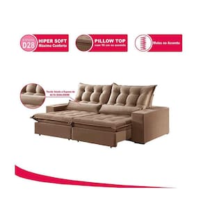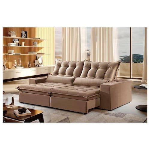 Caracteristicas: Pés: Madeira tom Tabaco. Tecido: Veludo Embalagem: Papel Ondulado, Plástico e Malha. : Almofada Rineira, Fibra Siliconizada. Os módulos são enviados separadamente, facilitando o transporte até o local desejado. Necessita Montagem: Sim. Fácil montagem, não é necessário montador. Capacidade em KG por Lugar: Aproximadamente 180kg. Aspirar o produto para eliminar a poeira, utilizar um pano levemente umedecido. Recomendações: Usar em local seco, não molhar. Evitar exposição ao sol, para que o produto não sofra alterações na tonalidade.