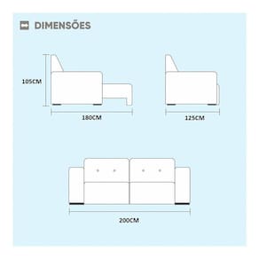 Dimensões: Altura: 105cm. Largura: 200cm. Profundidade: 125 cm Peso: 77 Kg Abertura aproximada: 180cm. Módulos: 80cm. Comprimento: 200cm. Braços: 20cm.