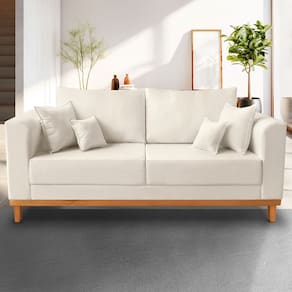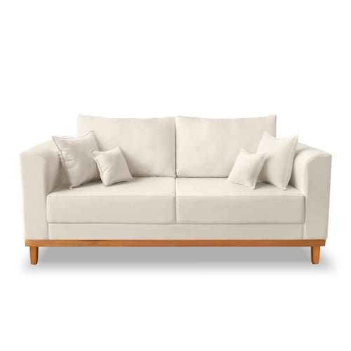 Sofá Viena 03 Lugares Com Base de Madeira Linho Bege - Madeira Prima Deccor Conheça o Sofá Viena, modelo de referência em elegância e segurança. O Sofá Viena é um luxo e vai tornar o seu ambiente ainda mais lindo e aconchegante. Conta com almofadas no encosto para trazer maior conforto e também acompanha almofadas de decoração para dar aquele toque final de bom gosto e sofisticação. O seu design é incrível para todos os ambientes, sua base e pés de madeira trazem a sustentação necessária e o tecido de alta qualidade fazem dele a combinação ideal para o seu ambiente! Dimensões do Produto Altura total: 77cm Largura total: 180cm Profundidade total: 80cm Altura do encosto: 34 cm Largura do assento: 150cm Profundidade do assento: 63 cm Altura do chão ao assento: 46 cm Espessura do assento: 17 cm Tamanho dos pés: 13 cm Altura do chão ao braço: 70 cm Altura interna do braço: 25 cm Espessura do braço: 15 cm Peso: 50 kg Especificações do Produto Estrutura: Madeira Eucalipto Espuma: D23 Tecido: Linho Tipo de pés: Pés Trapézio Peso Suportado: 200kg Garantia: 90 dias contra defeito de fabricação Montagem: O produto vai montado, apenas rosquear os pés Instruções de Limpeza: Utilizar um pano úmido com sabão neutro. Você irá receber: 01 Sofá em 01 volume Observações Importantes: Todos os produtos vão embalados com total segurança; As cores dos produtos podem sofrer alterações dependendo do seu monitor; Para futuras compras, não garantimos a mesma tonalidade de cor, pois existe variação a cada lote do fabricante do tecido; As imagens são meramente ilustrativas, não acompanham objetos de decoração e eletros; Confira as dimensões do produto no momento da compra e certifique-se de que passará normalmente por escadas, elevadores, portas e corredores; Importante: Por se tratar de estofado as medidas podem ter uma pequena variação em até 3 cm; Não nos responsabilizamos no ato da entrega por montagens, desmontagens, instalações de produtos; Não nos responsabilizamos no ato da entrega por subir escadas, elevadores, nem utilização de guinchos ou equipamentos similares para acesso a pisos superiores em apartamentos; A entrega do produto é realizada em todo território nacional, até onde as rodovias alcançam, entregas fluviais ou aéreas devem ser cotadas a parte; Observando as orientações acima, evita-se futuros desagrados ou imprevistos com a entrega do produto. Havendo despesas adicionais, serão de responsabilidade do cliente; Marca: Madeira Prima Deccor