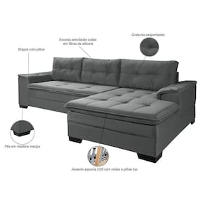 Cor: Preto | Altura: 92 | Peso do Produto: 40 | Garantia do Fabricante: 3 | Tonalidade: Preto | Cômodo Indicado: Salas | Produto: Sofá | Tipo de Tecido: Suede | Quantidade de Lugares: 3 | Complexidade de Montagem: Baixa: pode ser montado por uma pessoa leiga | Conservação e Manutenção do Produto: Não utilizar produtos químicos | Largura: 87 | Tipo do Sofá: com Chaise | Capacidade de Peso: 300 | Tempo Estimado de Montagem: 5 | Comprimento: 260 | Assento Retrátil: Não Retrátil Cor: Cinza 380