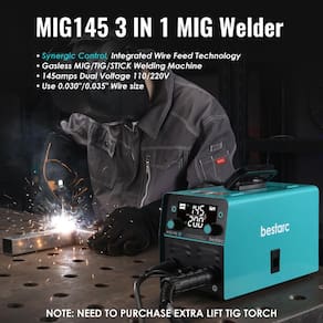 bestarc Soldador MIG 145A, máquina de solda Synergic MIG145 5GEN 3 em 1 Synergic MIG145 5GEN, soldador de fluxo portátil com tela digital - Soldador 3 em 1: o soldador MIG145 MIG tem multifuncional para MIG, Lift TIG e Stick. A corrente máxima é de 145 amperes, suporta fio mig com núcleo de fluxo de 0,1 cm/0,1 cm. O soldador mig sem gás se destaca na soldagem de aço inoxidável, aço carbono e até mesmo aço mais espesso, atendendo a diversas necessidades de soldagem. Vem com uma lanterna MIG removível de 2,5 m de comprimento para portabilidade. (É necessário comprar maçarico Lift Tig extra) - Tela digital: Projetamos esta máquina de solda MIG com tecnologia totalmente nova. Soldador MIG 110 V/220 V com tela digital LED voltagem, corrente e outros parâmetros. Você não precisa remover o capacete para avaliar o status do equipamento. Você pode fazer ajustes em tempo real, melhorando a eficiência e a precisão - Controle sinérgico: o soldador 3 em 1 adota IGBT e tecnologia de alimentação de fio integrada para corresponder automaticamente à tensão recomendada e velocidade de alimentação do fio (corrente). Ao mesmo tempo, o usuário também pode pressionar o botão de ajuste para ajustar individualmente a tensão ± 3 V, tornando-o acessível para iniciantes e profissionais - Dupla voltagem de 110/220 V: o soldador mig sem gás suporta tensão dupla de 110/220V, identificando automaticamente a tensão de entrada e exibindo claramente através do indicador do painel frontal. Este design permite que o soldador MIG funcione perfeitamente em diferentes ambientes de energia, proporcionando maior conveniência e aplicabilidade - O pacote inclui: 1 × máquina de solda MIG145 MIG, 1 × tocha MIG de 20 pés, 1 grampo de terra, 1 suporte de vara, 1 × fio com núcleo de fluxo de 0,76 cm, 2 × ponta de contato, 1 adaptador de fio de 220 V a 110 V, 1 escova de arame, 3 × haste de soldagem, 1 x manual do usuário