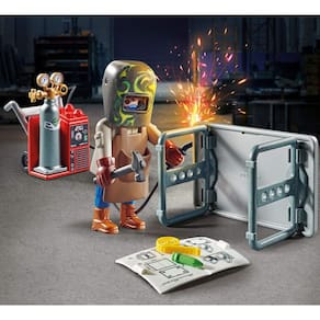 Playmobil - Soldador - Parte de uma linha colecionável, o soldador está ocupado na oficina hoje! O conjunto Special Plus apresenta um boneco completo com equipamento de segurança, incluindo um avental removível e cobertura facial. Há também uma mesa com pernas dobráveis para o soldador fixar, um manual de instruções, uma máquina de solda e outras ferramentas. - Possui uma máquina de solda e ferramentas - Inclui uma mesa com pernas dobráveis - O soldador está equipado com um avental e cobertura facial - Uma ótima opção de colecionador e dinheiro de bolso - Compatível com qualquer conjunto Playmobil