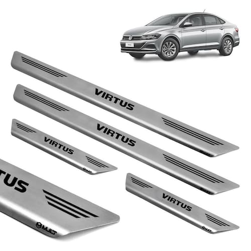 pelo fato de ser produzida em aço inoxidável, esta soleira é super-resistente e não enferruja. A instalação é fácil, e pode ser feita em casa sem nenhum problema. A fixação é personalizada, é feita com fita 3m especial, que não altera a espessura do produto, garantindo assim excelente durabilidade sem causar danos ao seu veículo. A soleira de porta protege seu carro contra riscos, além de proporcionar um visual esportivo para o automóvel, pois é personalizado e fabricado sob medida para cada veículo com alto padrão de tecnologia e matéria prima. Especificações: alta resistência. Rigoroso controle de qualidade. Maior cobertura da área das soleiras. Corte e gravação a laser. Identificação do modelo de cada soleira. Não deixa rebarba por ser cortado a laser. Fabricado em aço inox escovado de 0,6mm de alta qualidade. Fixação por fita dupla face 3m, a melhor do mercado. Tamanho dianteira : 45 cm x 05 cm cxa . Tamanho traseira : 16 cm x 05 cm cxa . Conteúdo da embalagem: 02 - soleiras dianteiras. 02 - soleiras traseiras. Compatível com: volkswagen virtus 2018 à 2022 compatível para todas as versões