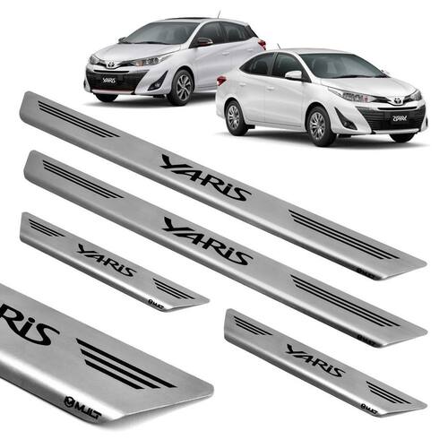 pelo fato de ser produzida em aço inoxidável, esta soleira é super-resistente e não enferruja. A instalação é fácil, e pode ser feita em casa sem nenhum problema. A fixação é personalizada, é feita com fita 3m especial, que não altera a espessura do produto, garantindo assim excelente durabilidade sem causar danos ao seu veículo. A soleira de porta protege seu carro contra riscos, além de proporcionar um visual esportivo para o automóvel, pois é personalizado e fabricado sob medida para cada veículo com alto padrão de tecnologia e matéria prima. Especificações: alta resistência. Rigoroso controle de qualidade. Maior cobertura da área das soleiras. Corte e gravação a laser. Identificação do modelo de cada soleira. Não deixa rebarba por ser cortado a laser. Fabricado em aço inox escovado de 0,6mm de alta qualidade. Fixação por fita dupla face 3m, a melhor do mercado. Tamanho dianteiro: 45 cm x 5 cm cxa . Tamanho traseira: 13 cm x 5 cm cxa . Conteúdo da embalagem: 02 - soleiras dianteiras. 02 - soleiras traseiras. Compatível com: toyota yaris 2018 à 2022 compatível para todas as versões