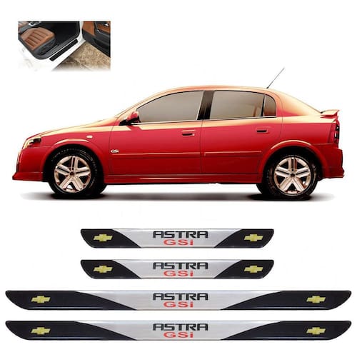 Kit de 4 Soleiras para o Chevrolet Astra GSi Contem: - Duas 2 soleiras grandes para a porta dianteira. - Duas 2 soleiras pequenas para a porta traseira. Referência: sr01123 Cor: Prata e Preto Comprimento: 49 cm / 28cm Largura: 3 cm todos Espessura: 0,5 cm todos Aplicação: Autocolante fita inclusa