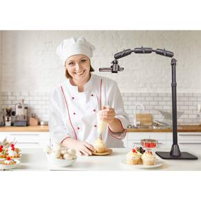 Suporte de celular Pro da Arkon para vídeos de demonstração de culinária e artesanato - Se estende de 43 a 74 cm, e a base pesada mantém o suporte no lugar. - Para transmissão ao vivo, teledifusão ao vivo, fazer vídeos ao vivo, demonstrações de projetos tipo "faça você mesmo(a)" enquanto faz artesanato, cozinha, pinta, desenha, etc. - Para todos os smartphones, incluindo iPhone & Galaxy. - Serve em celulares com capa até 900 g e até 4 polegadas (10 cm) de largura.