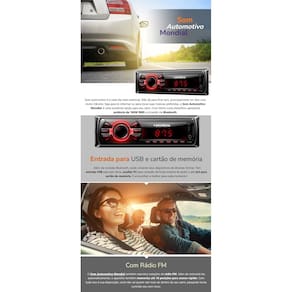 Som automotivo é a cada dia mais essencial. Não dá para ficar sem, principalmente em dias com muito trânsito. Seja para te informar ou para tocar suas músicas preferidas, o Som Automotivo Mondial é uma excelente opção para seu carro. Com ótimo custo-benefício, apresenta potência de 180W RMS e conexão via Blueth. Quando o trajeto não é só um simples caminho de passagem: som automotivo, o seu som transformando o seu dia-a-dia. Som automotivo Mondial vai com conexão Blueth, entradas USB e SD, entrada auxiliar e MP3.
