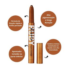 A Sombra para Olhos em Barra Stick Eyeshadow possui fórmula de fixação rápida e brilho perolado de longa duração adiciona dimensão e drama aos olhos. Pode usar como sombra, destaque e até delineador. Apontador incluído na parte inferior para ajudar na aplicação fácil e precisa. Sombra cremosa metalizada em bastão com alta pigmentação e intensidade.