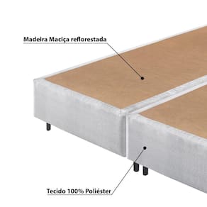 A melhor escolha para complementar a sua cama box, além de ser lindo, traz um charme inigualável. O Sommier Mescla Eco foi desenvolvido pensando no seu descanso e na qualidade do seu sonho. Conjunto resistente e firme, para colchões de tamanho Queen Size (não incluso). Tem pés fixos com 15cm de altura cada, é todo produzido em madeira reflorestada e o revestimento fica por conta de um lindo tecido 100% poliéster