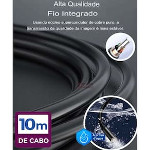 Seu cabo é de alta qualidade, pois usa em seu fio integrado, um supercondutor de cobre puro, aumentando a qualidade e a estabilidade de transmissão da imagem. Tem 10m de comprimento e é semi-rígido, para facilitar o seu uso em longas distancias e manter a câmera estável na posição.