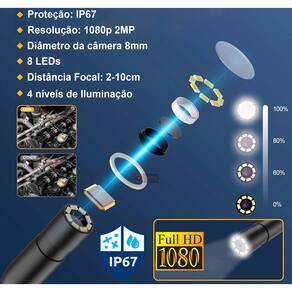 Especificações Técnicas: Resolução da câmera: 1920 x 1080p (2 MP) Diâmetro da câmera: 8 mm Campo de visão: 70° Foco: 2–10 cm Comprimento do cabo: 10 m (semi-rígido) Tela: 4,3” IPS Full HD 1080p Autonomia: até 5 h Tempo de recarga: até 3 h Conector: USB-C Grau de proteção: IP67