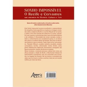 Quem lê muito e anda muito, vê muito e sabe muito. (Dom Quixote de la Mancha) Este Sonho Impossível mostra-se profundo e surpreendente. Ao mergulhar nesta experiência, as palavras e imagens reveladas sobre a cidade do Recife e o escritor Miguel de Cervantes, e sobre o livro Dom Quixote de la Mancha e as artes, cativam. Em suas nuances, é possível perceber traços de memorialismo e do cotidiano. A diversidade dos temas narrados conduz o leitor a conhecimentos de considerável apreço. E, na leitura, têm relevo as auxiliares Notas de Rodapé, descritas na dimensão histórica a que se referem. Tudo é para se ler, com proveito… Flanador (flâneur), cavaleiro andante, escudeiro, aviador, carnavalesco, escritor, colecionador, turista, livreiro, santa, pintor, bibliotecária, diplomata, dicionarista e navegador, são figuras presentes, capazes de provocar empatia. Nesse contexto, o essencial processo cultural tem como um eficaz exemplo a cidade do Recife, a Mauritsstad colonial, de tanta história e pioneirismo, que, em comunhão com Cervantes e os legados do Quixote, são um ânimo à consciência do saber, que nos levam a sonhar, a sonhar e lutar por um mundo melhor, por meio das letras