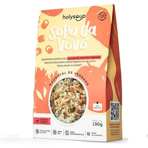 A Sopa da Vovó Holy Soup é a quintessência do conforto em um pacote prático. Ela é a personificação do amor e cuidado que uma avó dedica à sua família, agora disponível para você em qualquer momento. Esta sopa especial é uma mistura equilibrada de ingredientes nutritivos e saborosos, como macarrão sem glúten, flocos de batata, cenoura, quinoa, e uma seleção de vegetais desidratados que garantem uma experiência gastronômica saudável e reconfortante. Cada colherada é uma explosão de sabor e vitalidade, perfeita para aquecer o coração e nutrir o corpo.