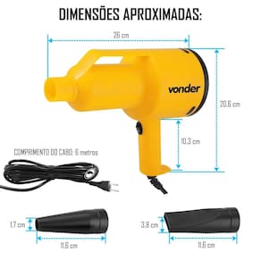 ESPECIFICAÇÕES TÉCNICAS: - Modelo: SAV 1200; - Potência: 1.200 W; - Rotações por minuto (rpm): 38.000/min; - Volume de saída de ar: 2,55 m³/min; - Velocidade de saída de ar: 9,16 m/s; - Temperatura do ar: 40°C; - Tensão: 127 V~; - Frequência: 50 Hz/60 Hz; - Massa aproximada (peso): 1 ,7 kg.