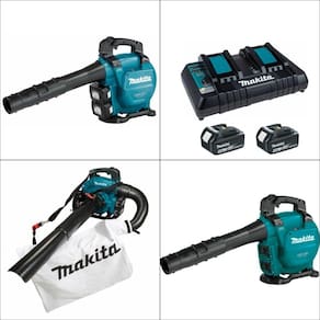 Observação: O soprador é fornecido com 2 baterias 18V (6,0Ah) BL1860B, tubos e coletor de aspiração. O carregador duplo rápido DC18RD, cinta de ombro, tubos e kit de aspiração são incluídos.