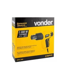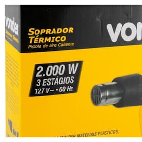 Soprador térmico 2000W 127 V / VONDER 3 Estagio Conteúdo da Embalagem: 1 Soprador térmico. Acompanha: 1 Bocal plano, 1 bocal de desvio, 1 bocal de ponta e 1 bocal de deflexão. Indicado para moldar materiais plásticos, artesanatos e remover tintas. Produz um fluxo de ar de alta temperatura, sendo indicado para profissionais como: encanadores, marceneiros, carpinteiros e pintores, além de ser muito útil em fábricas de móveis e em atividades relacionadas à moldagem de materiais plásticos, moldagem e instalação de canos de PVC, remoção ou secagem de pinturas, aplicação de películas, entre outras. Produto certificado de acordo com as normas IEC 60335-1, IEC 60335-2-45 e Portaria 371/2009 do Inmetro, atestando o rigor técnico e qualidade já reconhecidos da marca. Seu formato tipo pistola permite melhor manuseio e maior conforto durante o trabalho. Além disso, possui motor com dupla isolação, garantindo maior segurança ao operador.