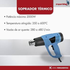 Com o Soprador Termico da Importway pode-se realizar trabalho como colagem de Plásticos, Aquecimento de Materiais, Remoção de Pinturas, Soldagens, Descongelamento de Tubulações , aplicação de termo-lacre, envelopamento de veículos, Artesanato, Linha Automotiva em Geral aplicações em geral.