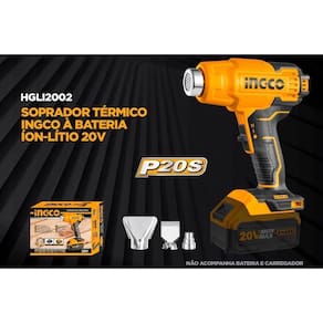 ATENÇÃO: Modelo SEM Bateria e Carregador, temos o modelo completo, caso tenha interesse solicitar o LinkO Soprador Térmico sem fio pode levá-lo a lugares que Soprador com fio não pode. Seu design compacto permite espaços apertados e diversas aplicações. Desde arame termo encolhível, colocação e insufilme, artesanato até remoção de tinta e decalque, este soprador de calor sem fio faz o trabalho. Possui uma saída de calor máxima de 550 C com duas configurações de temperatura. O bico é do tamanho padrão dos Sopradores do tradicionais, permitindo que acessórios de unidades com fio e outras marcas se encaixem com facilidade.Encaixe Universal de bateria pelo padrão P20S da Ingco permite que o produto aceite qualquer bateria Ingco 20v independente da amperagemCaracterísticas:Tensão: 20vTemperatura: 300 - 550 CFluxo de Ar: 100 - 200 L/MinAcompanha: 3 Bocais