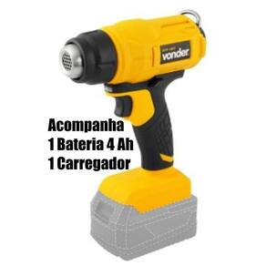 Produto composto de um soprador térmico vonder istv 1827 + 1 bateria ibv 1804, 18v 4ah + 1 carregador Conteúdo da embalagem: 1 soprador térmico. Acompanha: 3 bocais plano, centralizador e tipo gancho . Com formato tipo Ferramenta de aplicação que permite melhor manuseio e maior conforto durante o trabalho. Possui trava de segurança, impossibilitando acionamento involuntário e led auxiliar para iluminação no local de trabalho. Além disso, este equipamento utiliza um modelo de bateria intercambiável não acompanha , ou seja, uma bateria que é compatível com outros modelos de ferramentas a bateria vonder. Por isso, em sua próxima compra de ferramenta a bateria vonder, procure um modelo que comece com a referência i, ou que esteja identificado com o selo bateria intercambiável vonder. Desta forma, você garante modelos mais econômicos, sem a necessidade de aquisição de novas baterias e carregadores para uso em seu equipamento. Indicado para moldar materiais plásticos e uso em artesanato. Sua função é produzir um fluxo de ar de alta temperatura, sendo indicado para profissionais, como: encanadores, marceneiros e carpinteiros, além de ser muito útil em fábricas de móveis e em atividades relacionadas à moldagem de materiais plásticos, moldagem e instalação de canos de pvc, aplicação de películas, entre outras. Baterias indicadas: 60.04.180.400 4,0 ah e 60.04.185.000 5,0 ah . Carregadores indicados: icbv 1806 - 60.04.180.600 carregamento rápido , icbv 1805 - 60.04.180.500 carregamento convencional , icbv 1841 - duplo - 60.04.184.100 carregamento convencional , icbv 1842 - duplo - 60.04.184.200 carregamento rápido e icbv 1843 - com conector automotivo 12 v - 60.04.184.300 carregamento convencional . legal: 90 dias + contratual: 9 meses para locadoras, única e exclusiva de 90 dias Detalhes técnicos Modelo: istv 1827 Potência: 270 w Temperatura: 550c Carregador indicado: 60.04.180.600 carregamento rápido e 60.04.180.500 carregamento convencional Bateria indicada: 4,0 ah - 60.04.180.400 Tensão da bateria: 18 v Nº de estágios: 1 Nº de velocidades: 1 Linha: leve Fluxo de ar 1 estágio do soprador térmico: 200 litros/min Massa aproximada.: 600 g bateria : conteúdo da embalagem: legal: 90 dias + contratual: 9 meses Bateria : Bateria de íons de lítio, garantindo alta eficiência de operação. Possui indicador de nível de carga. Os três leds vermelhos indicam o status de carga da bateria. Um led aceso: indica baixa carga; dois leds acesos: metade da carga; e três leds acesos: bateria carregada. Possui entrada de ar para sistema de refrigeração e base emborrachada que ajuda a prevenir riscos em superfícies e absorver impactos leves. Indicada para a linha de ferramentas a bateria intercambiável vonder. Carregadores indicados: carregador de bateria 18 v icbv 1805 60.04.180.500 , carregador de bateria carga rápida 18 v icbv 1806 60.04.180.600 ou carregador de bateria para automóveis 12 v 60.04.184.300 . Modelo: ibv 1804 Tipo de bateria: íons de lítio Tensão v : 18,0 v Capacidade da bateria a : 4,0 ah Indicador de bateria fraca: sim Massa aproximada peso : 0,5 kg Fluxo de aplicação de cola: 15 g/min Tempo de aquecimento: 3 minutos