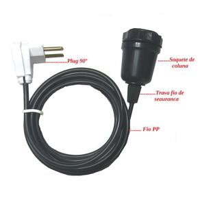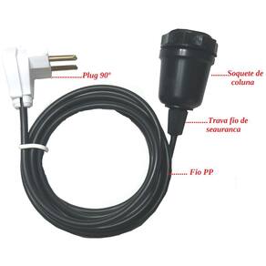 Soquete de coluna base E27 em cor preto com fio PP de 3 metros e plug lateral certificado INMETRO, conjunto ideal para iluminação em geral.