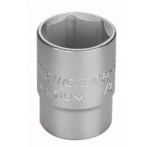Os soquetes da Tramontina PRO são produzidos com sistema Hyper Drive que melhora o acoplamento do produto ao parafuso ou porca, reduzindo as tensões geradas no aperto e prolongando a sua vida útil. Escolha o tamanho e perfil ideal para a sua necessidade e mãos à obra. Orientações Um grande avanço na produção dos soquetes é a introdução do conceito "Hyper Drive". Este novo perfil melhora o acoplamento do soquete na porca ou parafuso, reduzindo as tensões geradas no aperto, prolongando a vida do soquete e do elemento de fixação.Soquete forjado em aço cromo vanádio e temperado. Acabamento cromado. DIN 3124. Os soquetes são submetidos a testes rigorosos de torque e de dureza para atender a norma DIN 1711-1.Afrouxar e apertar parafusos e porcas sextavados.As ferramentas são produzidas e testadas conforme normas específicas. Observações Use óculos, luvas e outros equipamentos de proteção individual (EPIs) de acordo com a tarefa a ser executada. Selecione o tamanho do soquete conforme a bitola do parafuso ou porca. Para operações com parafusadeiras pneumáticas ou elétricas, use soquetes de impacto. Inspecione os soquetes antes de sua utilização. Soquetes que apresentam trincas ou desgaste excessivo devem ser substituídos. Armazene em local limpo e seco. Características Gerais EAN13 7891114025903 DUN14 17891114025900 NCM 8204.20.00 Peso Líquido 0,1000 kg. Peso Bruto 0,1000 kg. Metragem 0,000150 m³. Dimensões Embalagem (Compr. X Larg. X Alt.) 100x 50x 30 mm. Dimensões Produto (Compr. X Larg. X Alt.) 38x 28x 28 mm. Dimensão Extra A 27,8 mm. Dimensão Extra B 38,0 mm. Dimensão Extra C 24,0 mm. Dimensão Extra D 20,0 mm.