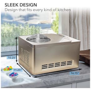 Cor Dourado Estilo Sorveteira Faça deliciosos sorvetes e iogurtes caseiros que você pode personalizar totalmente a seu gosto com a Máquina de Sorvete e Iogurte Whynter ICM 220CGY 2 Litros. Incrivelmente fácil de usar, você pode criar sorvetes deliciosos, gelato cremoso rico e sorbet, bem como iogurte natural fresco e saudável do estilo tradicional ao grego, usando ingredientes em que você confia no conforto da sua casa. Ideal para entretenimento, esta máquina de alta capacidade produz até dois litros de sua sobremesa favorita congelada ou estilo de iogurte em um único lote. A função de sorvete oferece funções premium e recursos não disponíveis em máquinas de orçamento. O poderoso congelador com compressor integrado permite o uso contínuo sem a inconveniência de ter que pré congelar o copo de mistura de aço inoxidável
