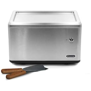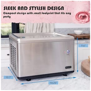 Sorveteira elétrica portátil Whynter ICR 300SS com compressor integrado, capacidade de 0,5 litros, ideal para preparar sorvete frito em menos de 5 minutos. Inclui 2 espátulas de aço inoxidável e pés de sucção para estabilidade.Bowl de congelamento