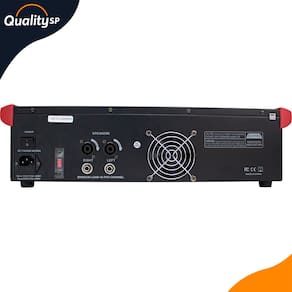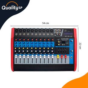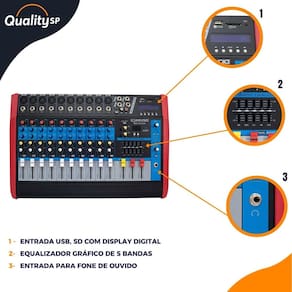 Especificações Técnicas: • 10 canais mono com entradas balanceadas XLR de linha P-10 • Equalização de 2 vias (grave e agudo) por canal • possui efeitos de 24 bits • 16 Efeitos • Processador de efeitos com tela de LCD • Equalizador gráfico de 5 bandas • 1 auxiliar send/ efeitos • Entrada USB/SD com display digital • Gravação e reprodução direta em USB • Função Bluetooth • Leds indicadores de pico • Potência de saída 250W + 250W em 4O • Duas saídas SPEAKON • Bivolt (com chave seletora)