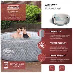 Equipado com uma bomba que infla rapidamente o spa, aquece o, executa a filtragem e controla o sistema de massagem para um spa fácil e conveniente que inclui uma tampa, bomba de spa, flutuador químico, 2 cartuchos de filtro VI, 1 remendo de reparo e um cabo de 6 pés de comprimento.